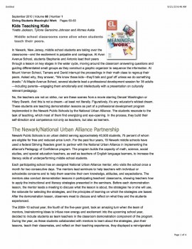 The article outlines an instructional practice occurring in Newark Public School district, wherein middle school students, under the instruction of teachers and National Urban Alliance mentors, guide the rest of their class through a lesson, assuming the role of primary instructor. Every student during the course of the year gets the opportunity to lead the class through one lesson, and spends time before their turn learning the content and instructional practices they will need to be effective. The benefits of this program affect the whole classroom, as the experience of being a student teacher is consistently a positive one.