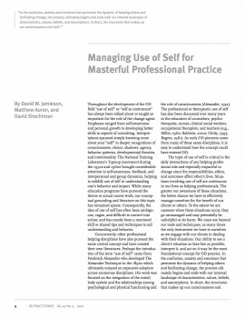 The authors attempt to clarify the idea of use of self and explain how to use it in action. They explain use of self as “the conscious use of one’s whole being in the intentional execution of one’s role for effectiveness in whatever the current situation is presenting.” The authors suggest managing use of self through awareness and exploration of self as well as seeing, knowing, and doing.