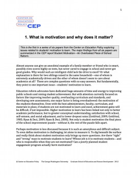 This first paper in a series by the Center on Education Policy discusses the role of student motivation in education and how to support it. The CEP lists the four dimensions of motivation as competence, control/autonomy, interest/value, and relatedness.